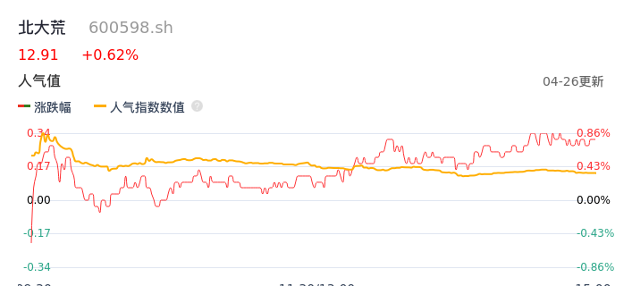 04月26日,北大荒收报12.91,股价涨幅0.62%,成交金额1.74亿元,换手率0.76%。