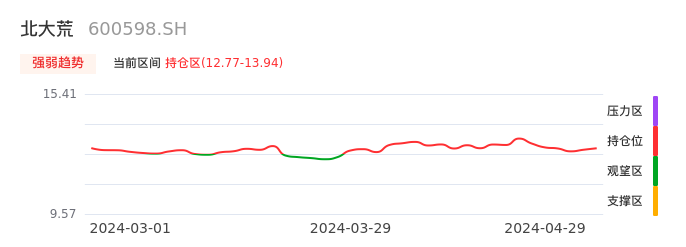 我们来看一下该股的九方特色指标强弱趋势的情况:北大荒自03月29日从观望区上穿到持仓区。股价近期在多头区域持续强势上扬,上升动能仍较为充足,可积极关注。后续重点关注上方压力位:13.94元是否能突破上攻。
