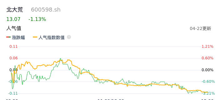 04月22日,北大荒收报13.07,股价涨幅-1.13%,成交金额2.69亿元,换手率1.15%。