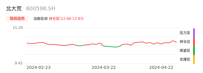 我们来看一下该股的九方特色指标强弱趋势的情况:北大荒自03月29日从观望区上穿到持仓区。股价近期在多头区域回调整理。后续重点关注多空分界点的争夺:12.66元。如未能有效站稳则可能重新回到空头行情。