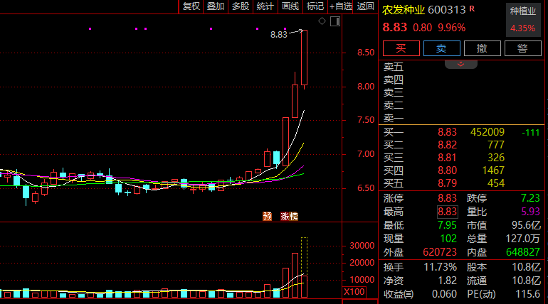 农业概念快速走强,农发种业3天2板,秋乐种业、神农种业、北大荒、康农种业跟涨。