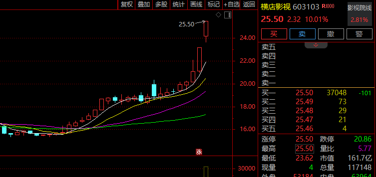 影视板块震荡拉升,横店影视2连板,博纳影业、江苏有线、幸福蓝海、华策影视、金逸影视冲高。