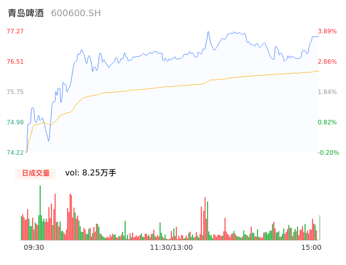 04月15日,青岛啤酒收报77.12,股价涨幅3.68%,成交金额6.29亿元,换手率1.17%。