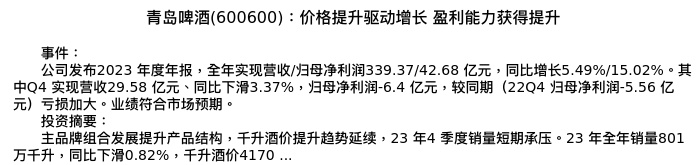 值得注意的是:2024年04月申港证券的徐广福分析师,首次发布关于青岛啤酒的研究报告,标题为:青岛啤酒(600600):价格提升驱动增长 盈利能力获得提升。