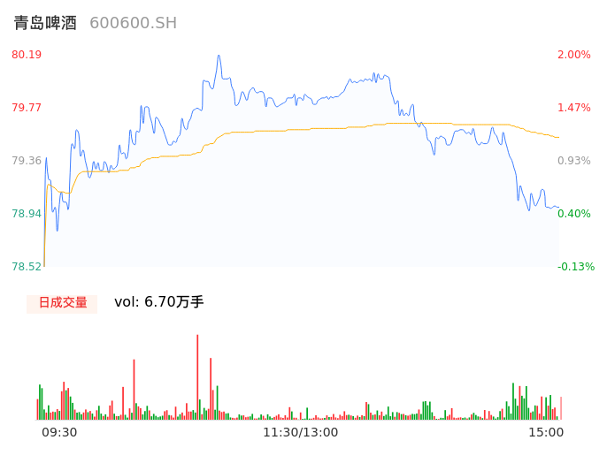 04月26日,青岛啤酒收报79.00,股价涨幅0.48%,成交金额5.33亿元,换手率0.95%。