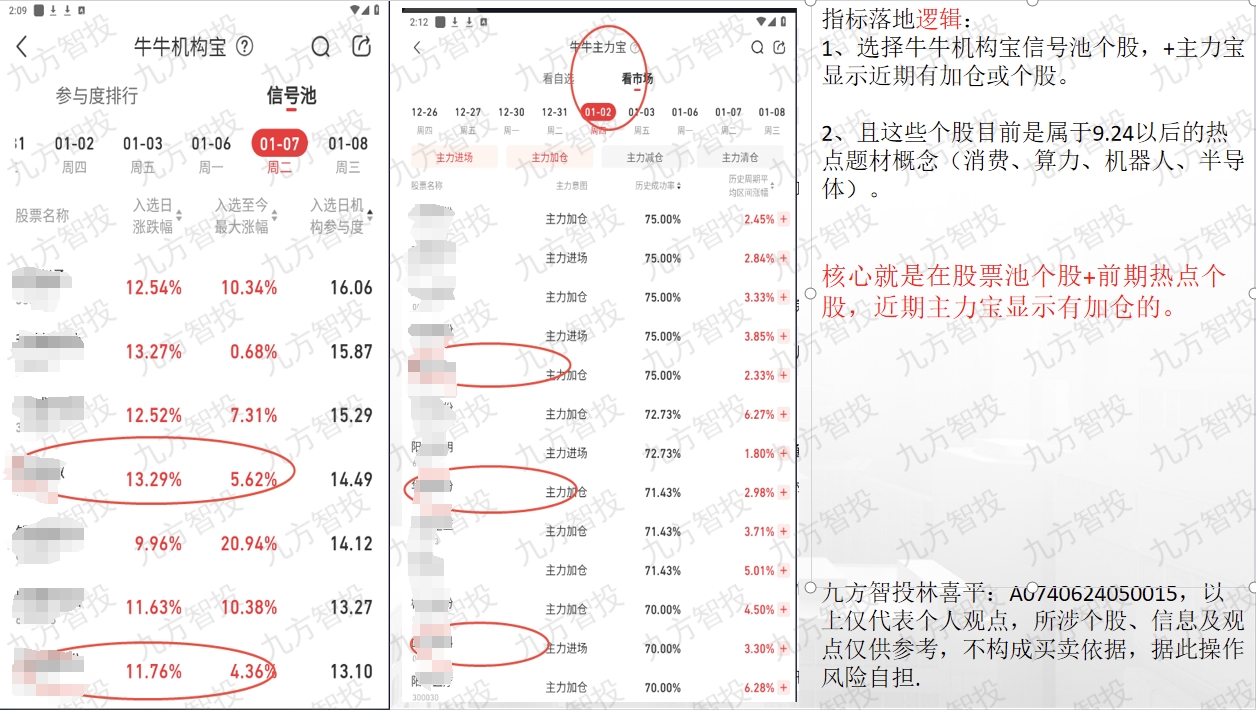 2、当下背景下,如果交易,选择9.24以后的热点题材个股,且没有出现拉升,机构参与度上升的,有主力拉升的。步骤:选择牛牛机构宝信号池个股+主力宝显示近期有加仓或个股,且这些个股目前是属于9.24以后的热点题材概念(消费、算力、机器人、半导体)。 如图: