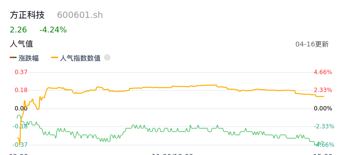 04月16日,方正科技收报2.26,股价涨幅-4.24%,成交金额9821.27万元,换手率1.03%。