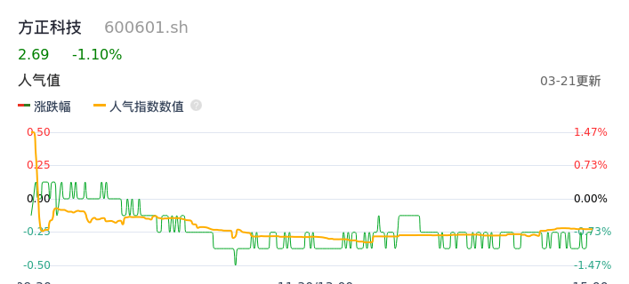 03月21日,方正科技收报2.69,股价涨幅-1.10%,成交金额1.25亿元,换手率1.10%。