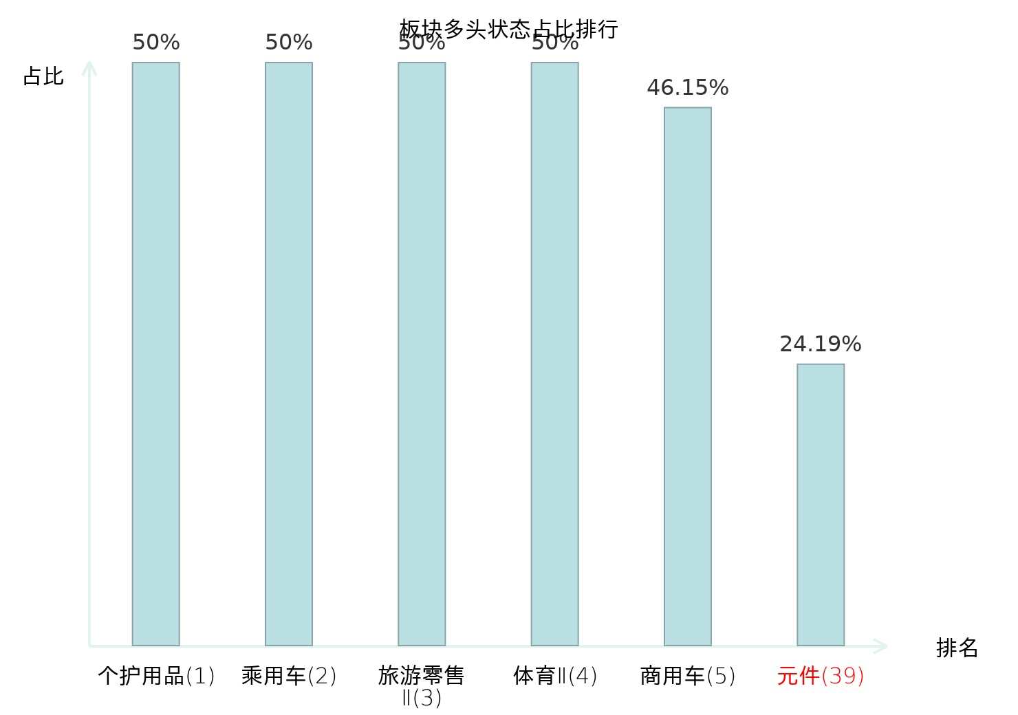 全市场所有行业板块中主力多头状态占比排名中,个护用品板块位居第一。林业Ⅱ板块名次提升最快,较昨日上升94位。