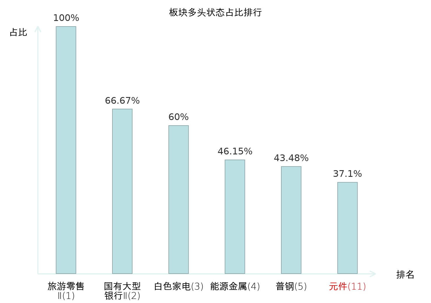 全市场所有行业板块中主力多头状态占比排名中,旅游零售Ⅱ板块位居第一。光学光电子板块名次提升最快,较昨日上升59位。