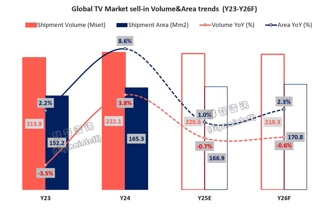 展望2026年,虽然世界杯赛事拉动,北美退税季及印度消费税改对需求有一定支撑,但受存储芯片半导体价格飙涨带来生产成本压力陡增等因素影响,预计全球TV市场全年出货量同比下降0.6%。然而成本压力有望转化为产品结构升级的推动力,带动平均尺寸恢复增长,预计2026年全球TV出货面积同比增长2.3%。