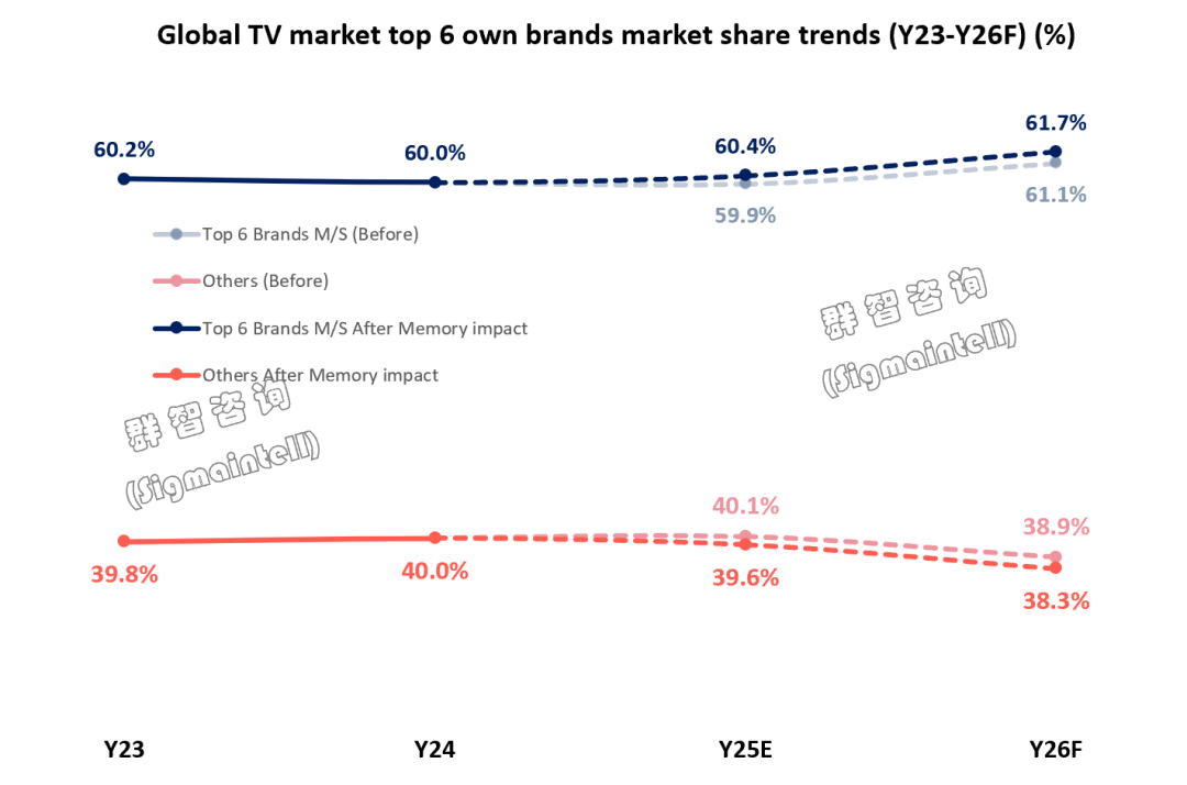 存储成本上涨推动市场份额进一步向头部品牌聚集,尾部厂商或面临洗牌随着AI算力需求爆发与存储产能调整加剧了消费电子终端存储芯片供应紧缺,DDR4及eMMC价格持续暴涨,群智咨询预测存储芯片的高水位价格将蔓延至2026年全年,这将对深陷获利困境的电视品牌造成巨大的挑战。在此背景下,头部品牌凭借与原厂的供应协议,获得优先供货保障和相对优势的成本竞争力,或将有望在全球电视市场中进一步扩大份额,而中小品牌受高成本挑战面临生存压力,市场份额将呈现收缩。