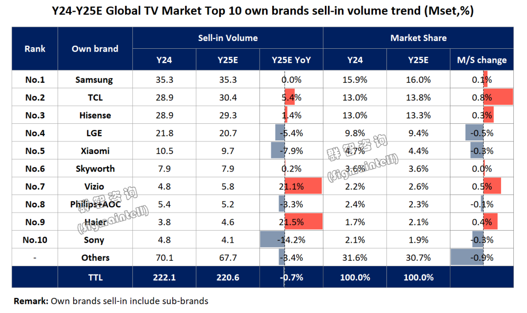 2025年全球市场出货量预计达到3527万台,同比持平。作为行业领导者,其核心战略通过 “硬件+AI+内容+服务”构建生态闭环,提升用户粘性并创造持续服务收入。市场份额微降既是市场充分竞争的结果,也是其主动放弃低端市场、聚焦高附加值产品的战略选择。2026年,三星电视业务策略将以“供应链减负+高端创新”为核心。面板采购端,增加京东方(BOE)面板供应量以谋求面板厂商间的平衡和增强供应链韧性;产品端,一方面扩大OLED电视出货规模稳定全球电视金字塔顶端产品份额,同时通过Micro-RGB技术强化Mini LED产品竞争力;市场端,深耕欧美高端市场的同时,凭借品牌影响力与产业链优势平衡新兴国家中低端产品份额,同时借助存储芯片的供应链优势,预计2026年全球出货或将继续同比持平。