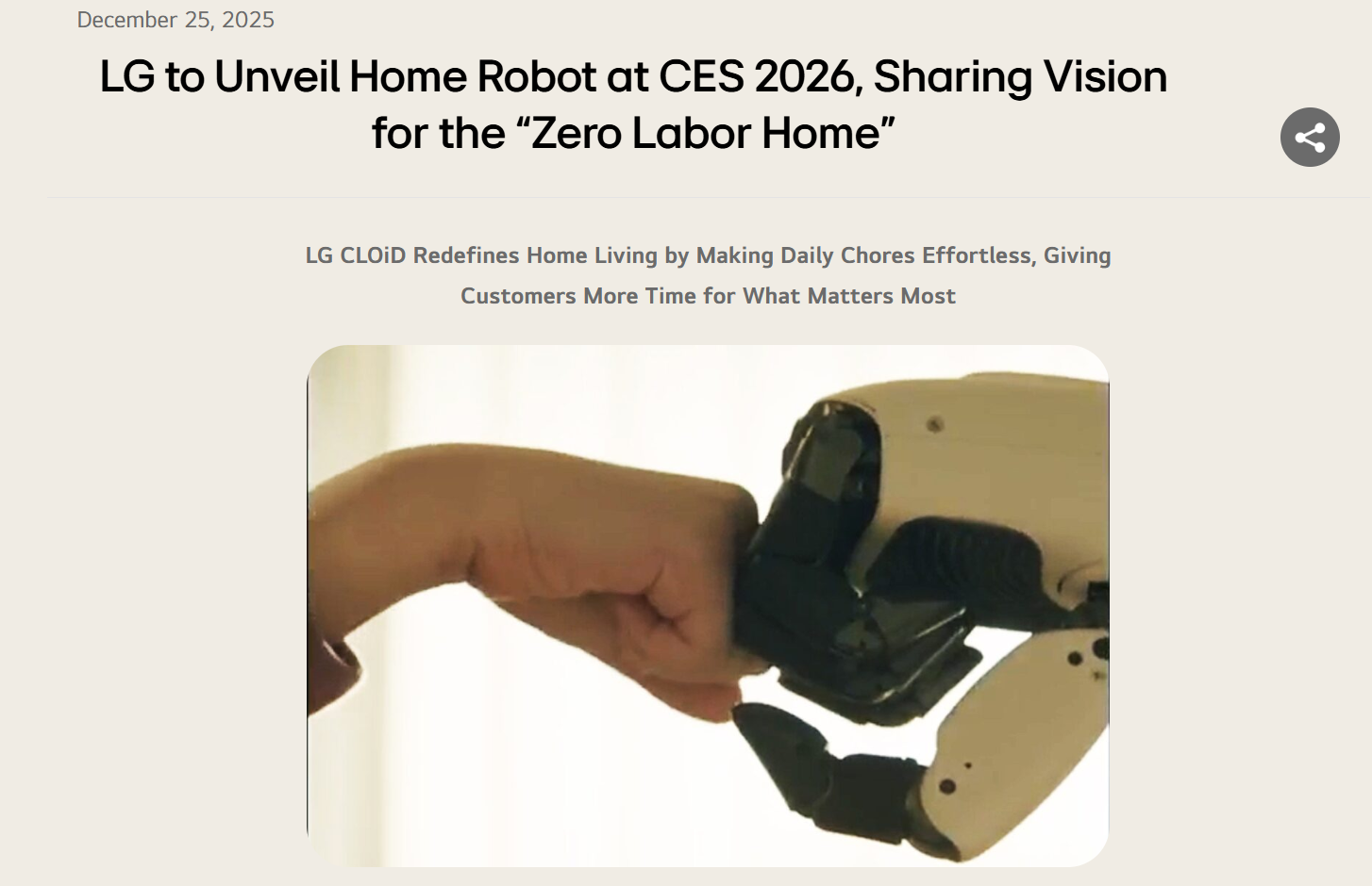数小时前,韩国家电巨头LG电子发布公告称,公司将于明年1月6日至9日举办的CES展会期间首发家用机器人LG CLOiD,展示“家务归零、更多高质量时光”的愿景——通过技术切实减轻日常家务负担,让使用者能够将更多时间与精力投入到真正重要的人和珍贵的时刻中。
