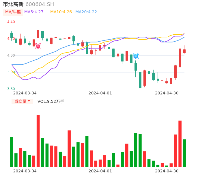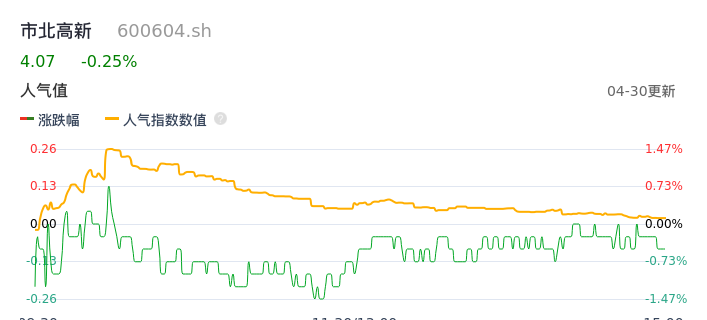04月30日,市北高新收报4.07,股价涨幅-0.25%,成交金额3864.34万元,换手率0.68%。