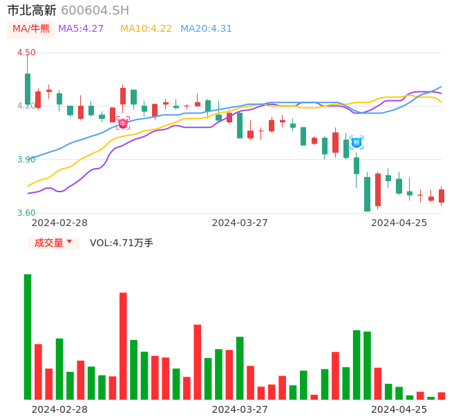04月25日,市北高新收报3.73,股价涨幅1.08%,成交金额1754.17万元,换手率0.33%。