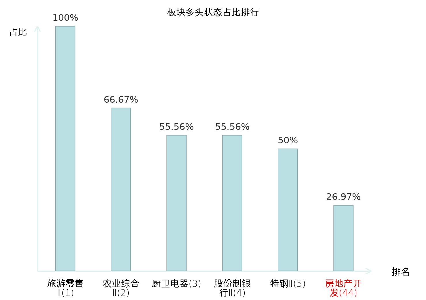 全市场所有行业板块中主力多头状态占比排名中,旅游零售Ⅱ板块位居第一。装修装饰Ⅱ板块名次提升最快,较昨日上升75位。