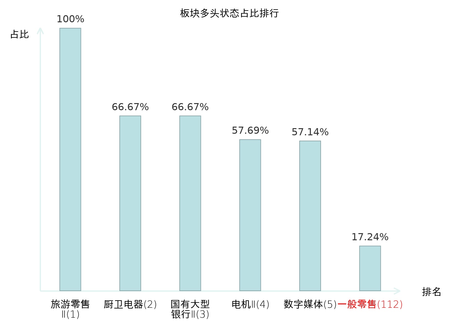 全市场所有行业板块中主力多头状态占比排名中,旅游零售Ⅱ板块位居第一。汽车服务板块名次提升最快,较昨日上升70位。