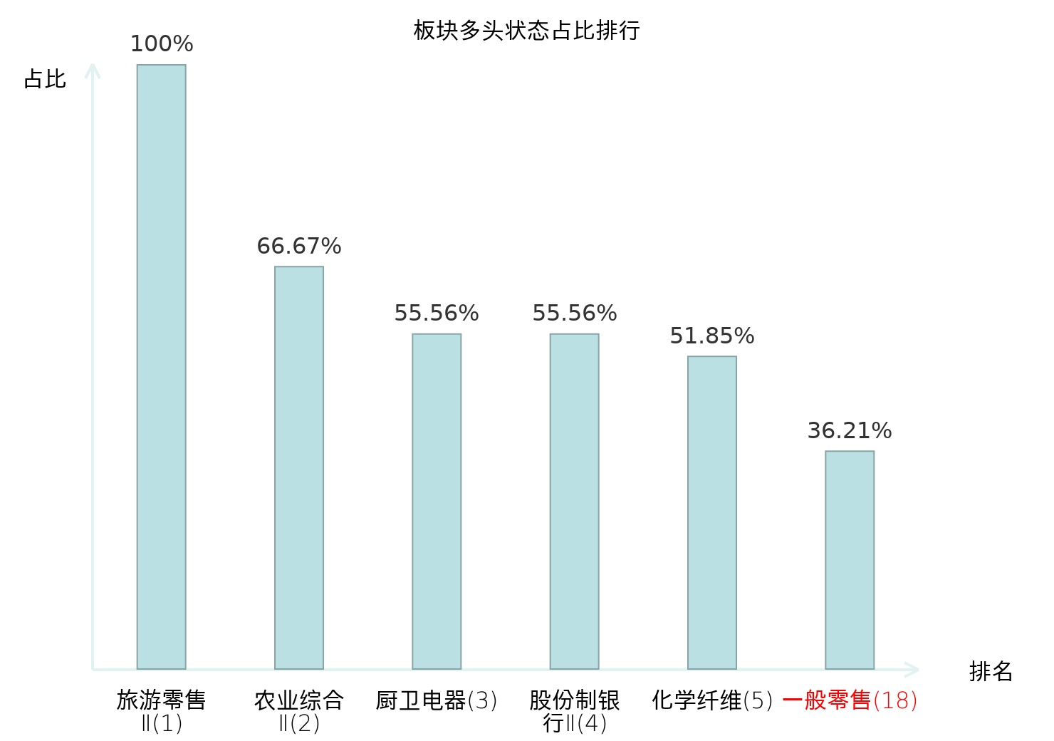 全市场所有行业板块中主力多头状态占比排名中,旅游零售Ⅱ板块位居第一。国有大型银行Ⅱ板块名次提升最快,较昨日上升103位。