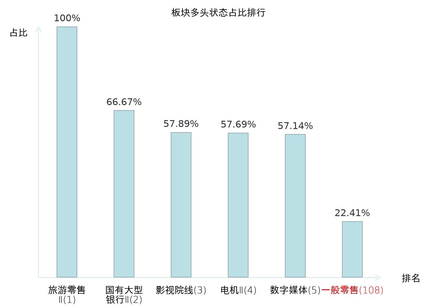 全市场所有行业板块中主力多头状态占比排名中,旅游零售Ⅱ板块位居第一。专业连锁Ⅱ板块名次提升最快,较昨日上升56位。