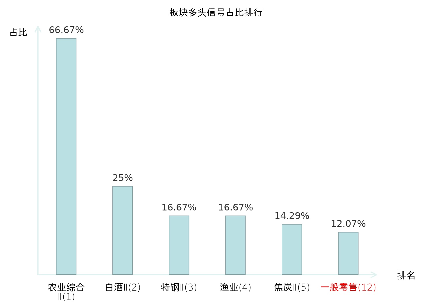 全市场所有行业板块中主力多头信号占比排名中,农业综合Ⅱ板块位居第一。农业综合Ⅱ板块名次提升最快,较昨日上升127位。