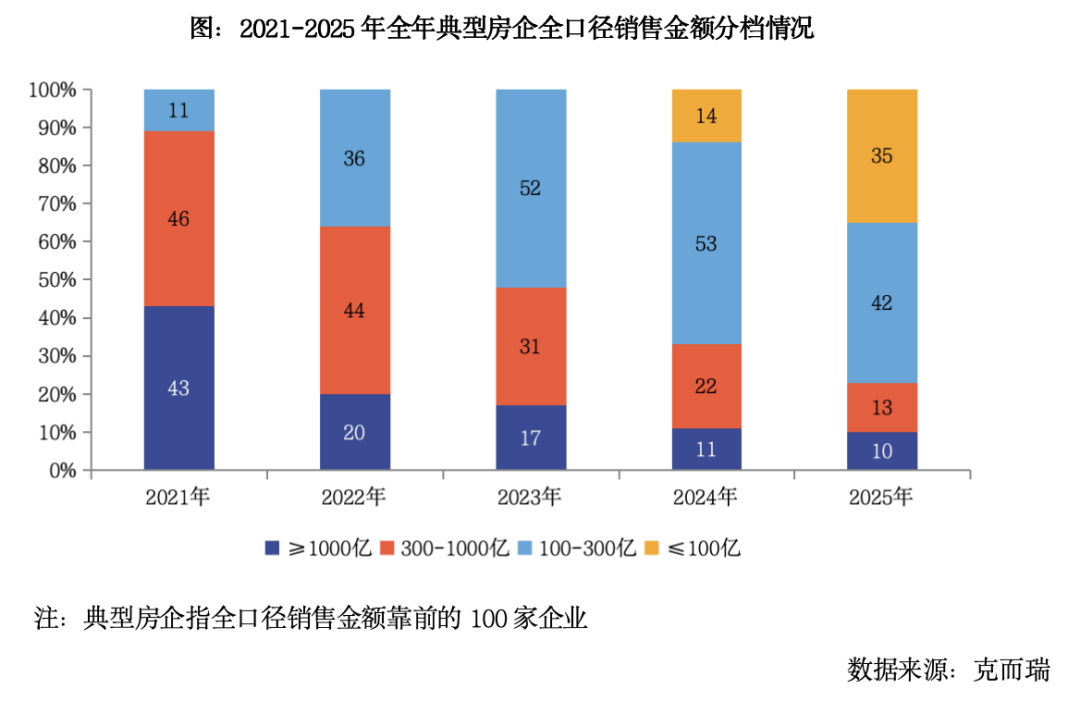 2025年房地产市场延续筑底态势,房企销售整体保持低位运行。从典型房企的全口径销售情况来看,全年销售规模超过1000亿元的企业共有10家,300-1000亿的企业有13家,100-300亿的企业有42家,100亿以下的企业有35家。