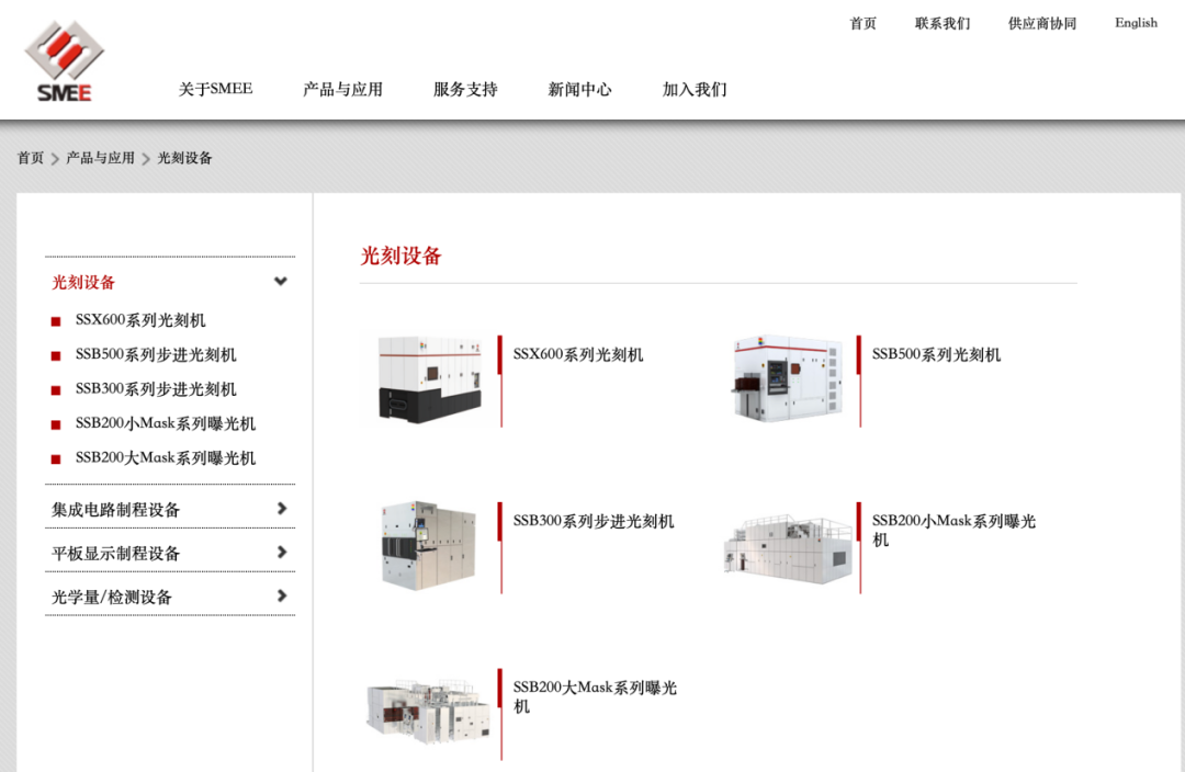 上海微电子的光刻设备主要包括,SSX600系列步进光刻机、SSB500系列步进光刻机、SSB300系列步进光刻机、SSB200小Mask系列曝光机、SSB200大Mask系列曝光机。