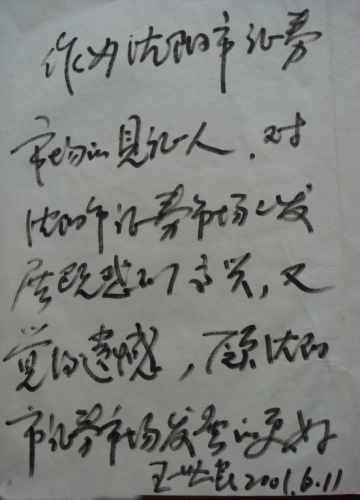2001年6月11日王世良接受本人采访,回忆当年沈阳证券市场情况并题词