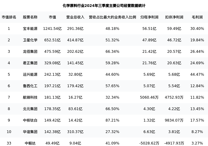 中毅达最新报告期数据为三季度,下表汇总了化学原料行业内市值靠前的公司三季度主要经营数据