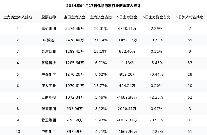 从主力资金流向来看,化学原料行业今日主力资金流入19.50亿元,在所有申万二级行业中排名:43/131。