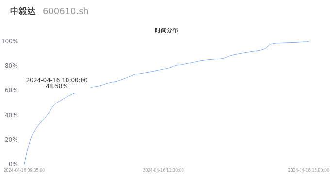 首先我们来看当日成交的时间分布。将今日交易时间按照5分钟的时间间隔进行切片,并绘制分布直方图进行观察。可以发现,10点之前的成交量占全天成交量的48.58%,这说明,该股票活跃时段换手火爆,资金热情高涨。