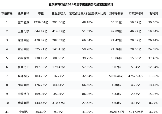 中毅达最新报告期数据为三季度,下表汇总了化学原料行业内市值靠前的公司三季度主要经营数据