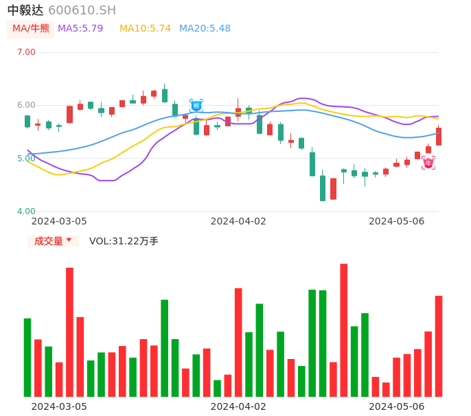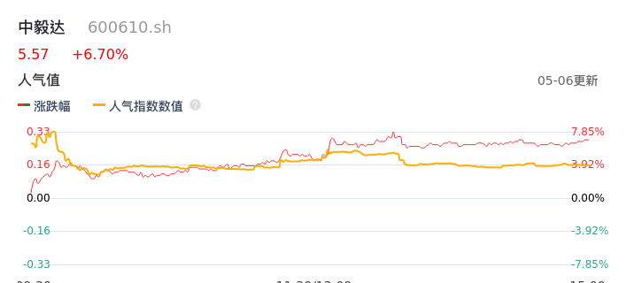 05月06日,中毅达收报5.57,股价涨幅6.70%,成交金额1.71亿元,换手率6.96%。