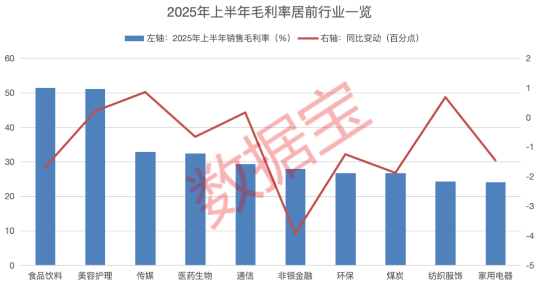 据证券时报·数据宝统计,剔除金融行业(银行及非银金融),申万一级行业中,食品饮料行业今年上半年毛利率依旧稳居冠军宝座,达51.41%;美容护理、传媒行业毛利率排在第二和第三位。