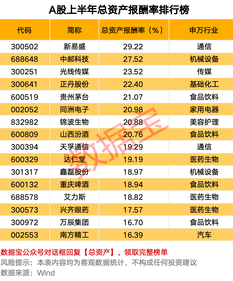总资产报酬率是企业运用权益资本和债务资本的总体获利能力,也是评价企业资产运营效益的重要指标。上半年,A股上市公司总资产报酬率超过10%的有82家,超20%的上市公司近9家。