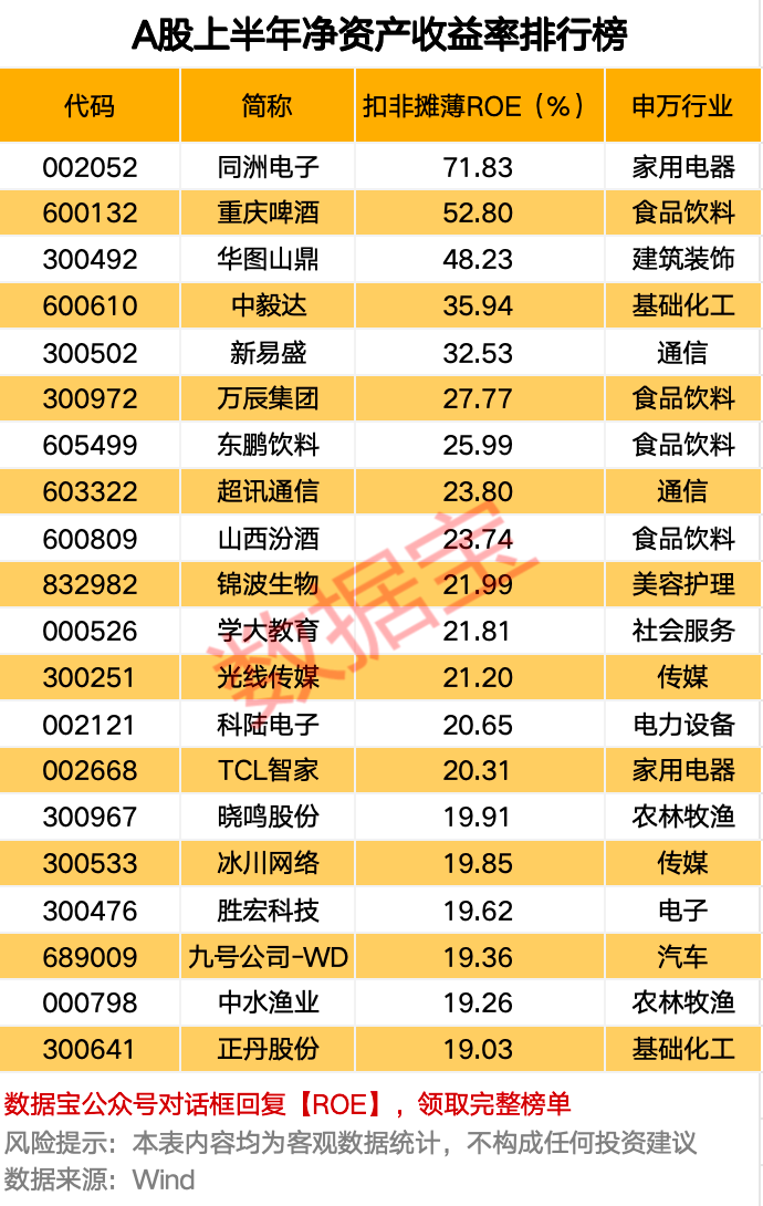 上半年扣非摊薄净资产收益率最高的是同洲电子,达71.83%。重庆啤酒、华图山鼎、中毅达等个股的净资产收益率居前。