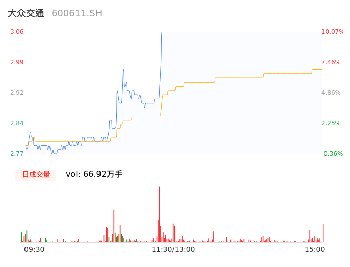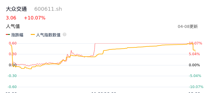 04月08日,大众交通收报3.06,股价涨幅10.07%,成交金额1.99亿元,换手率4.28%。