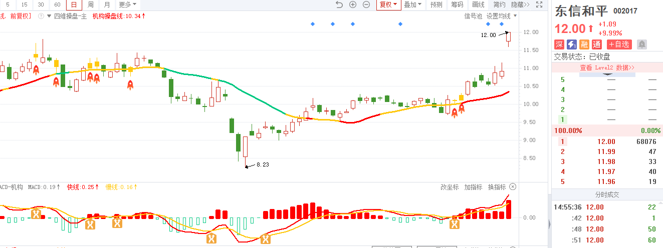 1)东信和平-四维操盘-近期出现火箭信号且底部量柱由绿转红