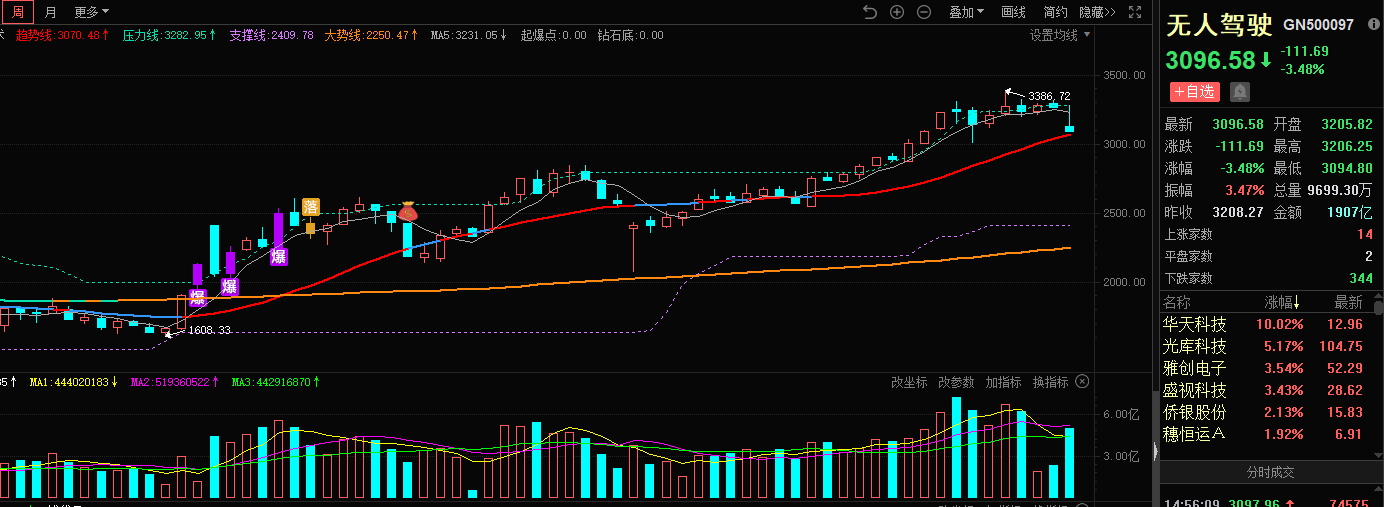 无人驾驶板块指数周K线显示,板块指数处于中期趋势上涨过程中的回踩形态,经纬操盘指标红色趋势线形成支撑,上周大盘大跌,个股亏钱效应明显,板块被大盘拖累也出现了调整,但中期上升趋势仍然保持完好,下周即将公布十五五规划,无人智驾板块有望成为资金优先关注的方向!
