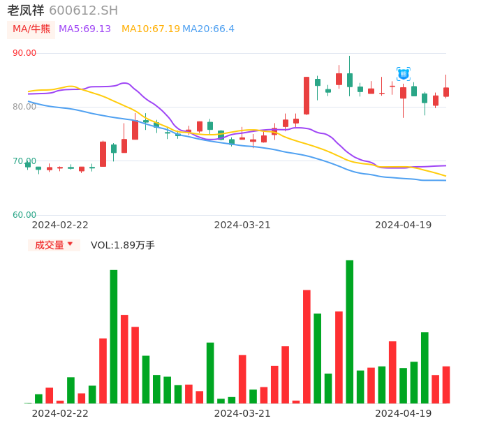 04月19日,老凤祥收报83.55,股价涨幅1.79%,成交金额1.59亿元,换手率0.60%。