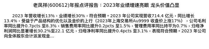 值得注意的是:2024年04月国盛证券的杨莹/侯子夜/王佳伟分析师,首次发布关于老凤祥的研究报告,标题为:老凤祥(600612)年报点评报告:2023年业绩增速亮眼 龙头价值凸显。