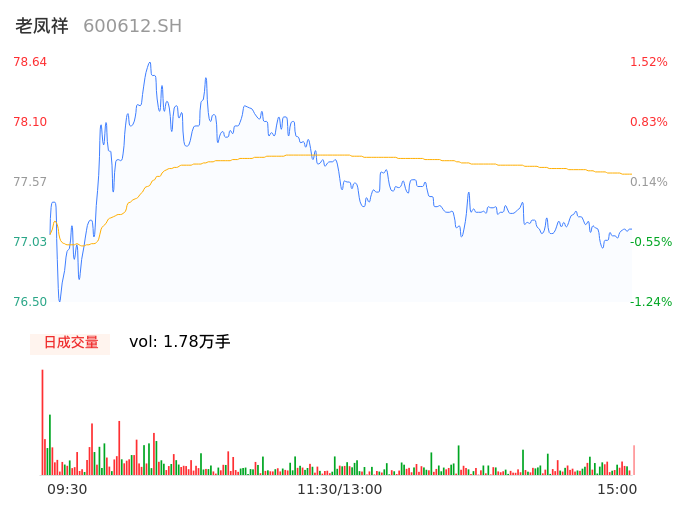 04月30日,老凤祥收报77.23,股价涨幅-0.30%,成交金额1.39亿元,换手率0.56%。