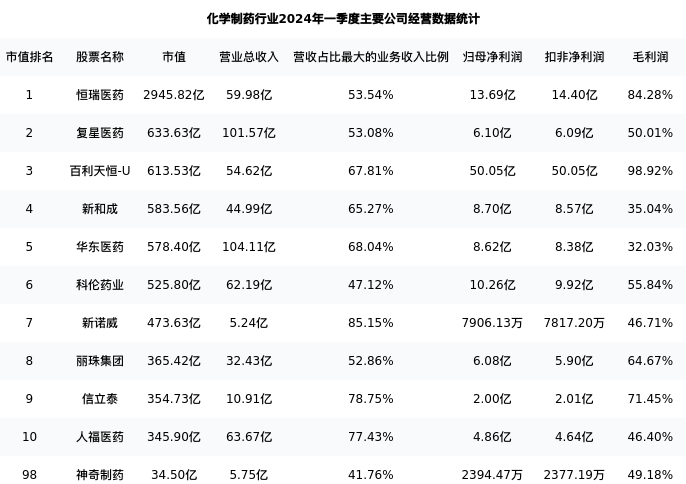 神奇制药最新报告期数据为一季度,下表汇总了化学制药行业内市值靠前的公司一季度主要经营数据