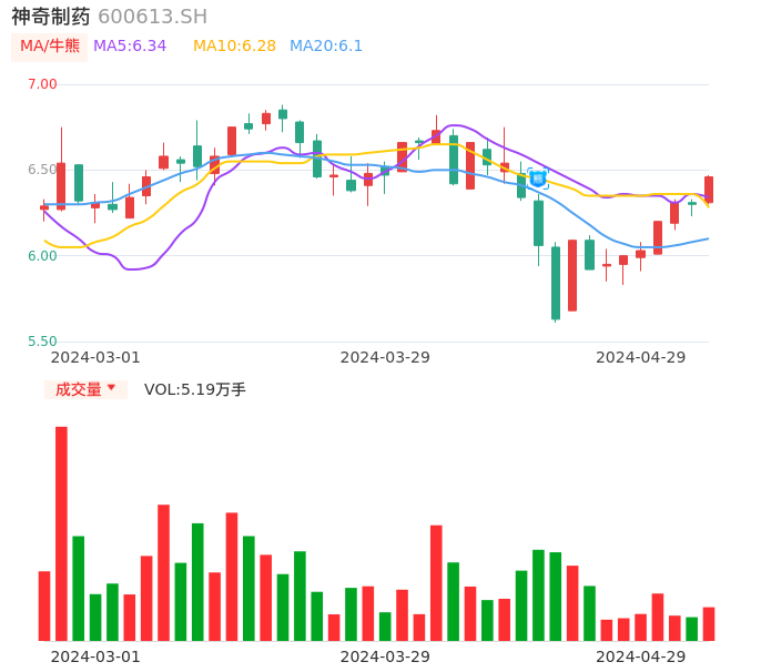 04月29日,神奇制药收报6.46,股价涨幅2.54%,成交金额3330.03万元,换手率1.08%。