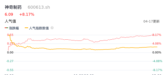 04月17日,神奇制药收报6.09,股价涨幅8.17%,成交金额4698.73万元,换手率1.65%。