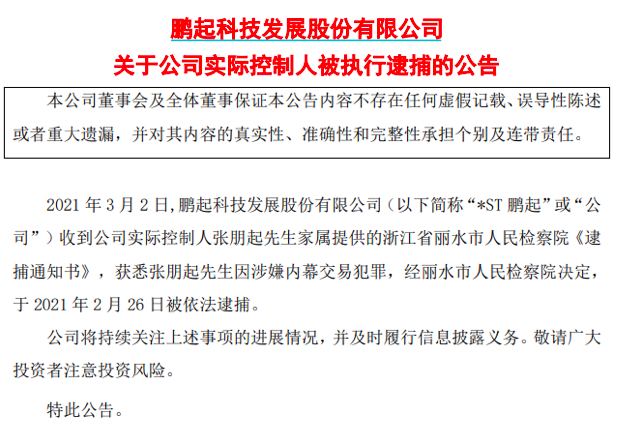 3月2日晚,*ST鹏起发布公告称,公司实际控制人张朋起因涉嫌内幕交易犯罪,于2021年2月26日被依法逮捕。