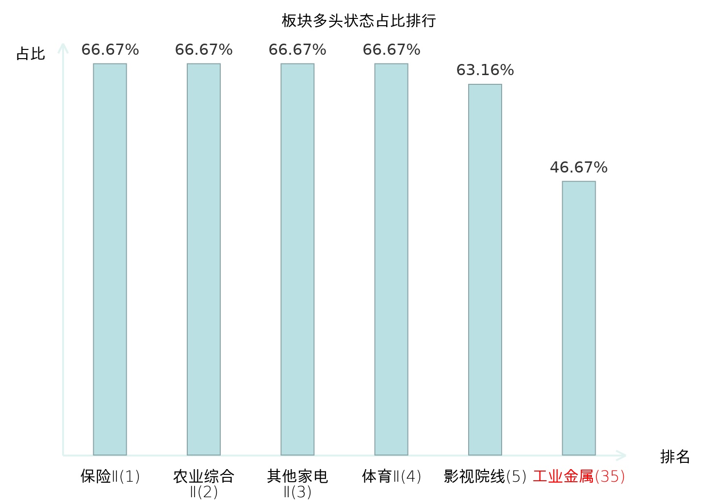 全市场所有行业板块中主力多头状态占比排名中,保险Ⅱ板块位居第一。冶钢原料板块名次提升最快,较昨日上升53位。