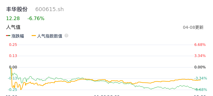 04月08日,丰华股份收报12.28,股价涨幅-6.76%,成交金额9977.43万元,换手率4.22%。