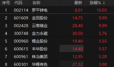 上证报中国证券网讯 8月20日早盘,有色金属板块震荡走强,截至9时42分,罗平锌电、金田股份、云南锗业涨停,金力永磁、锡业股份、丰华股份、株冶集团涨逾5%,华锡有色等跟涨。