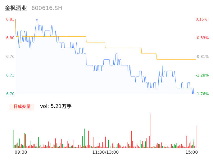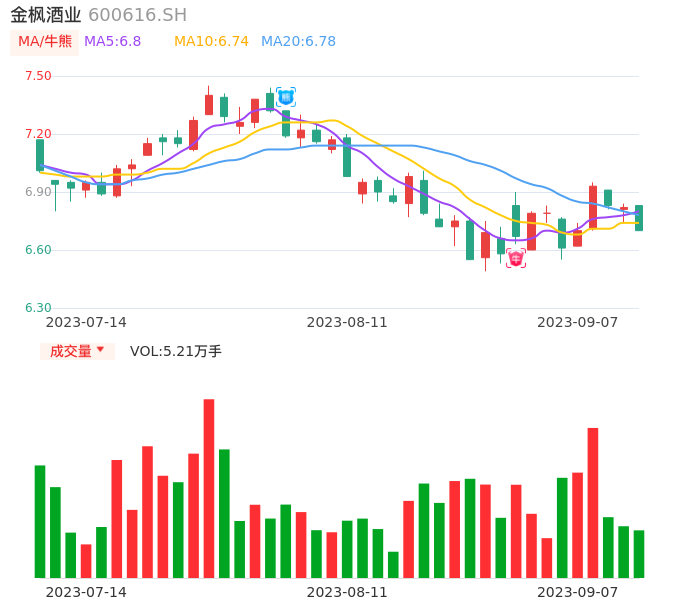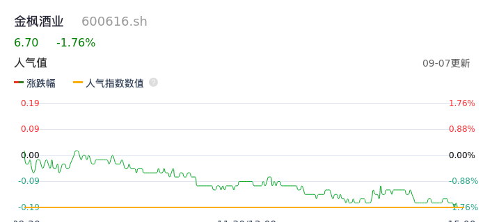 09月07日,金枫酒业收报6.70,股价涨幅-1.76%,成交金额3517.31万元,换手率0.78%。